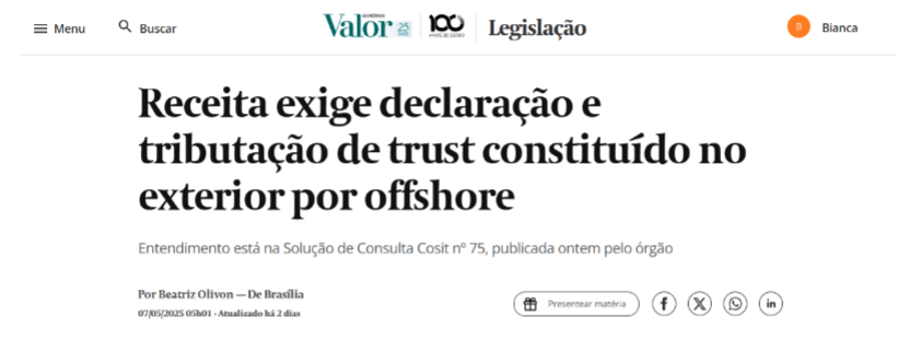 A Receita Federal publicou a Solução de Consulta Cosit nº 75, estabelecendo quebrasileiros indicados como beneficiários de trusts irrevogáveis e discricionários no exterior — inclusive aqueles criados por meio de offshores — devem declarar e tributar os rendimentos e ganhos de capital no Imposto de Renda da Pessoa Física (IRPF), conforme a Lei nº 14.754/2023.